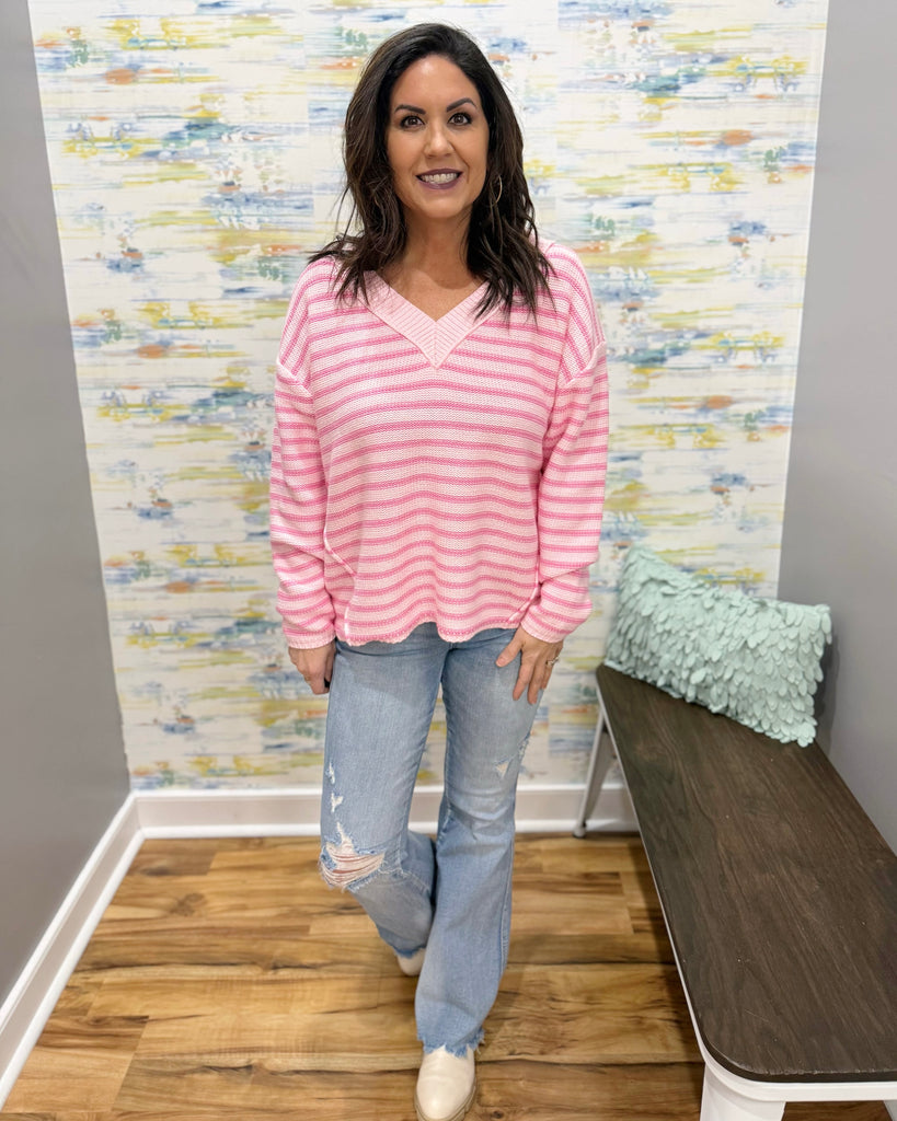 Meet your new go-to sweater for effortless, everyday style. Our Kayce Striped Drop Shoulder Sweater features a relaxed silhouette with an easy drop shoulder design that gives it that perfectly laid-back look we all love. The classic stripe pattern adds timeless appeal, while the soft knit keeps you comfy from morning errands to cozy nights out.