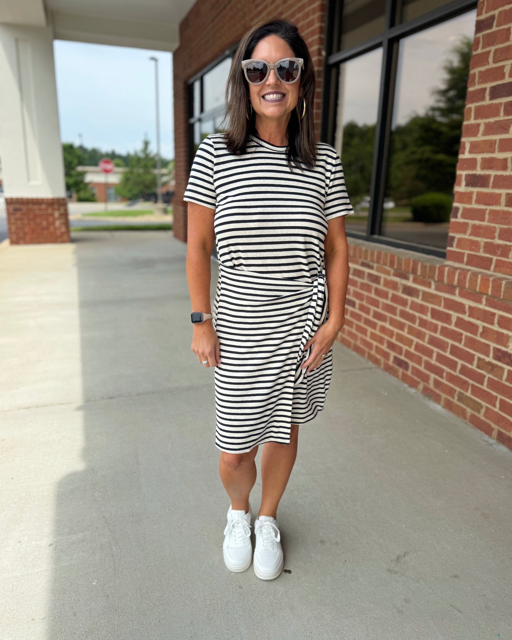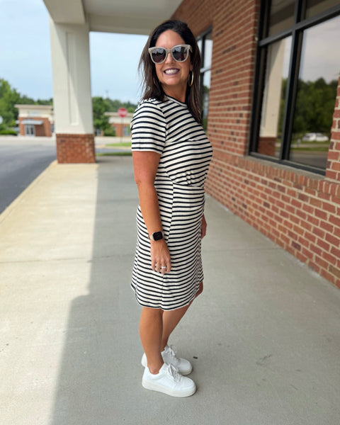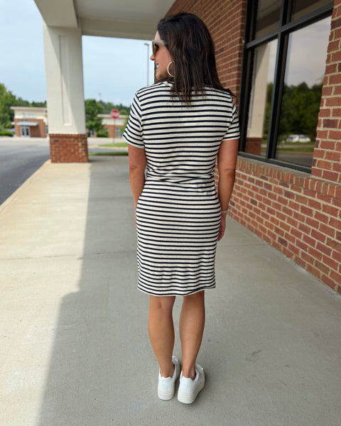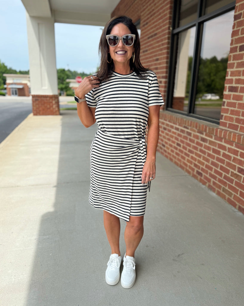 Maggie Stripe Faux Wrap Dress in Navy FINAL SALE - Madi Savvy Boutique
