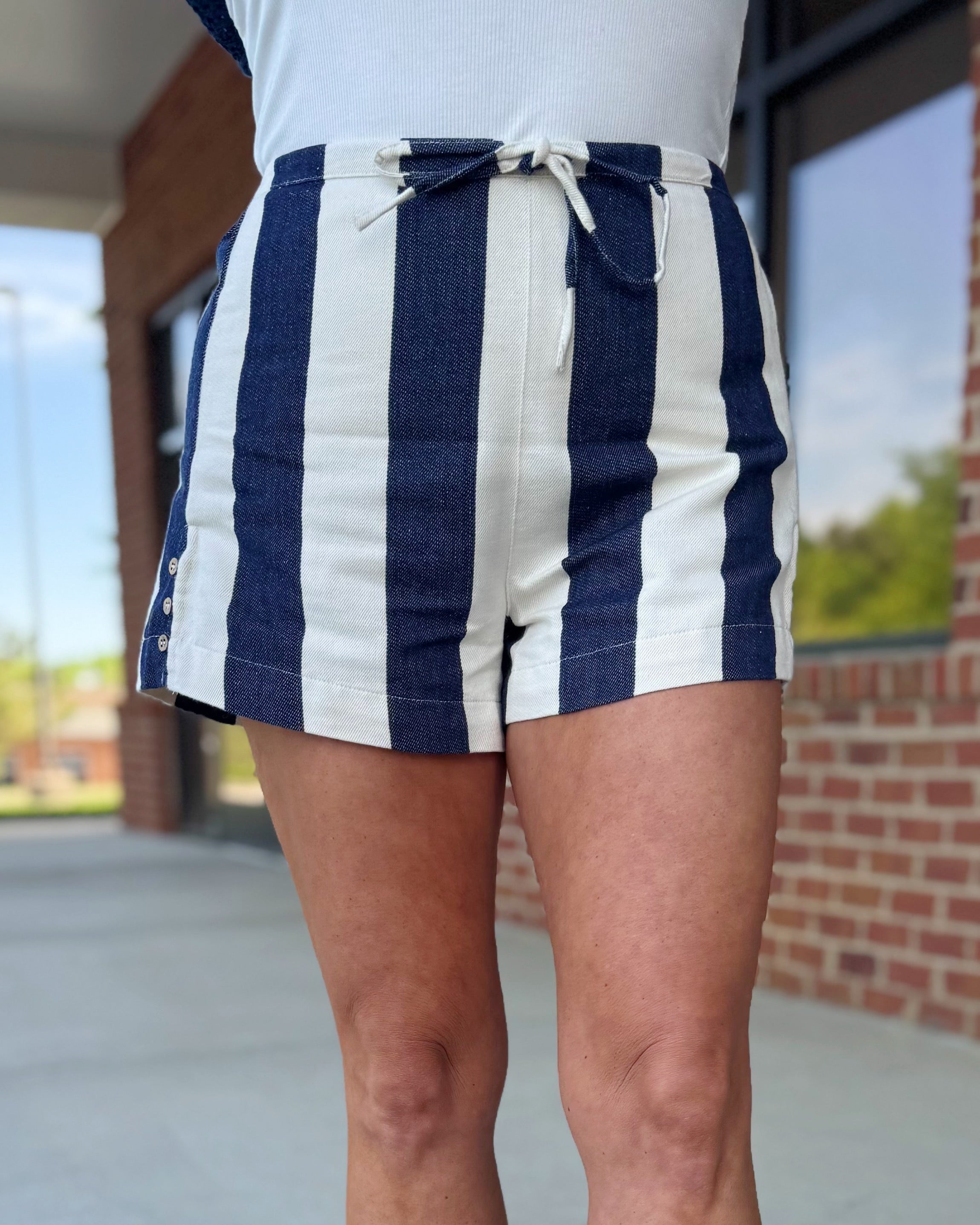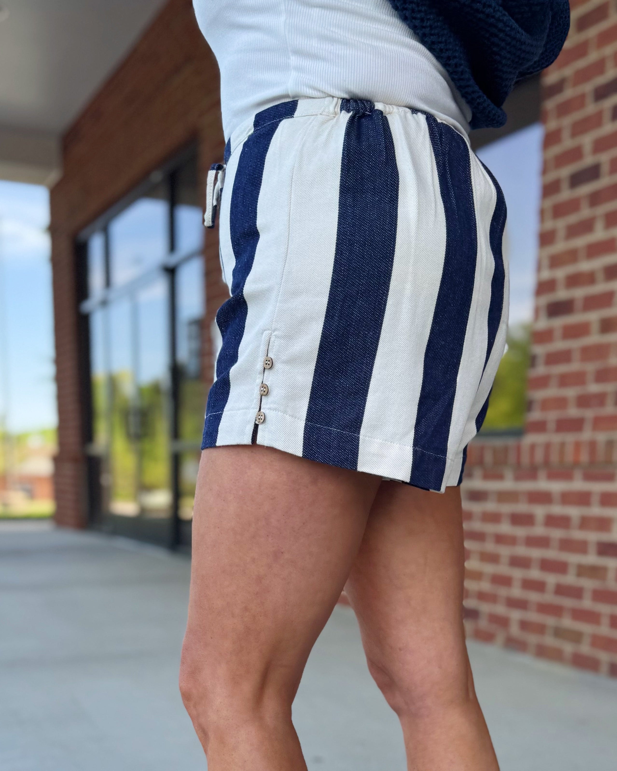 Breezy and effortlessly cool, our Rita cotton striped shorts in navy/natural are your go-to for warm days and laid-back plans. Designed with an elastic back waistband and adjustable drawstring for a comfy, customizable fit, plus functional side buttons that add just the right touch of detail.