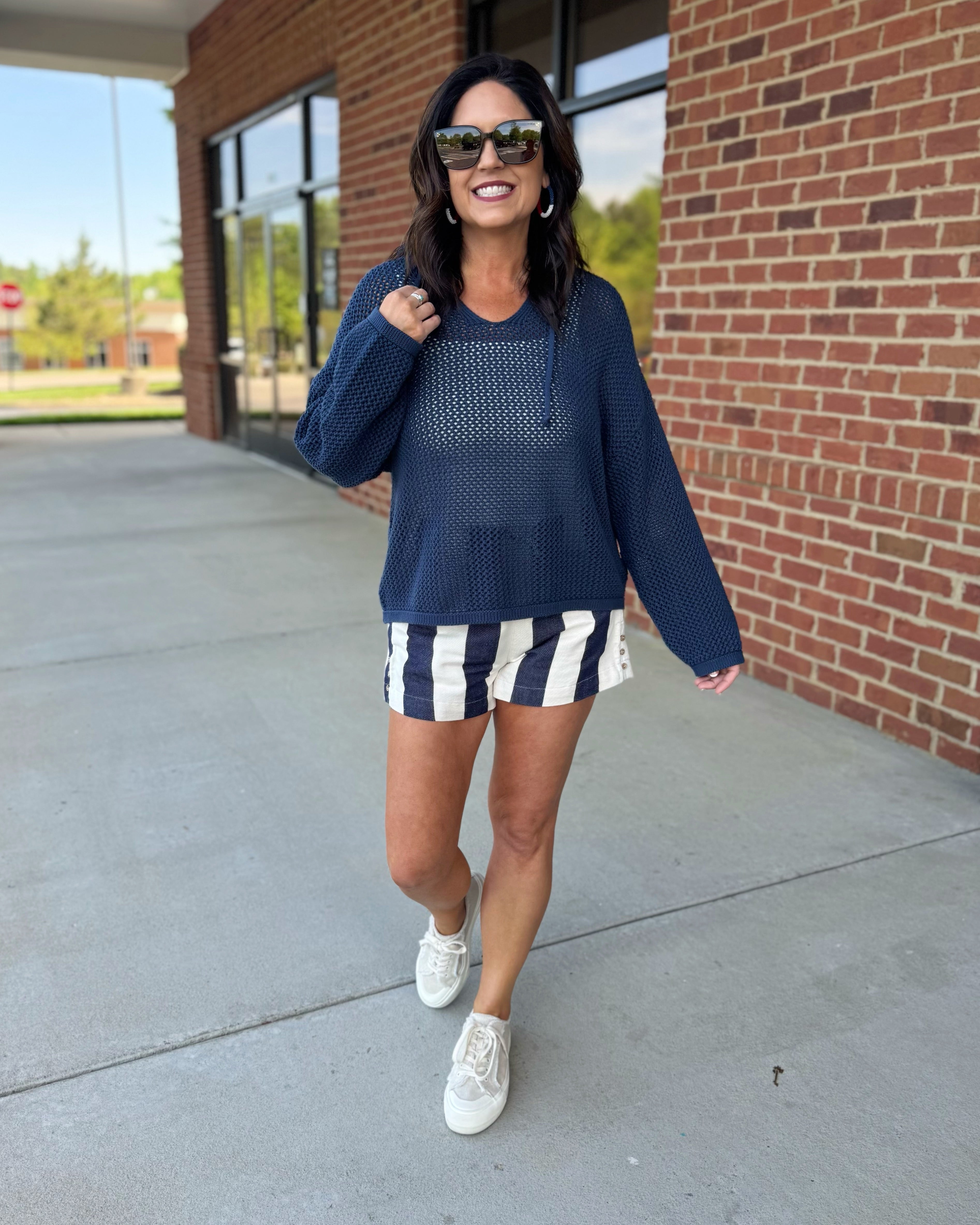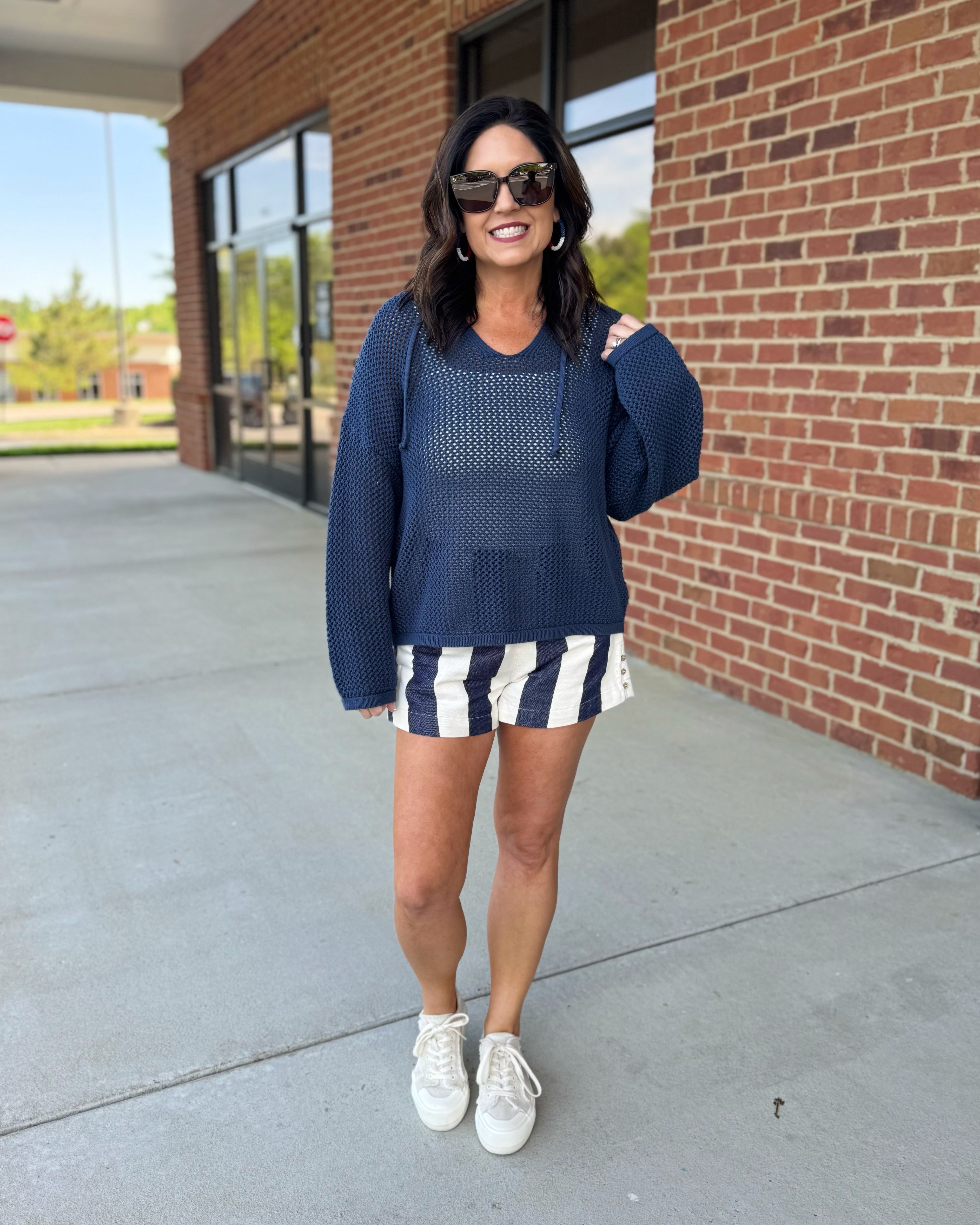 Stacy is 5'4", bust 36C, 5/6 in pants, and a small or medium in most tops depending on fabric and stretch. Stacy is wearing a size small in these shorts.