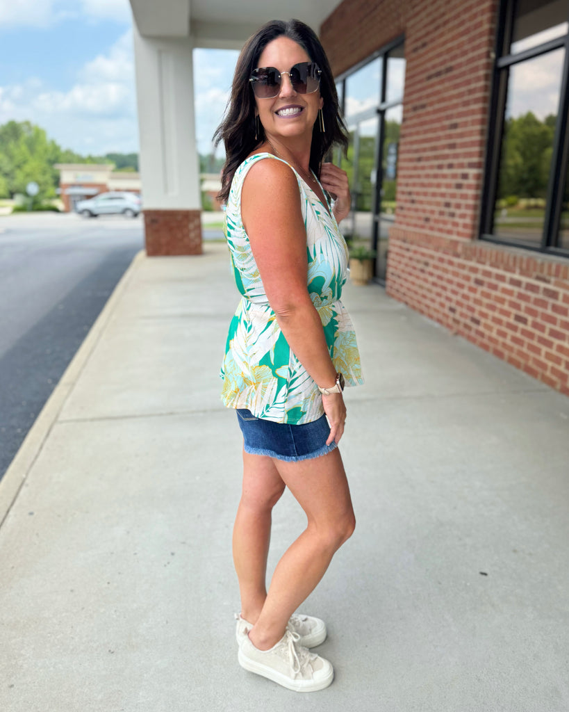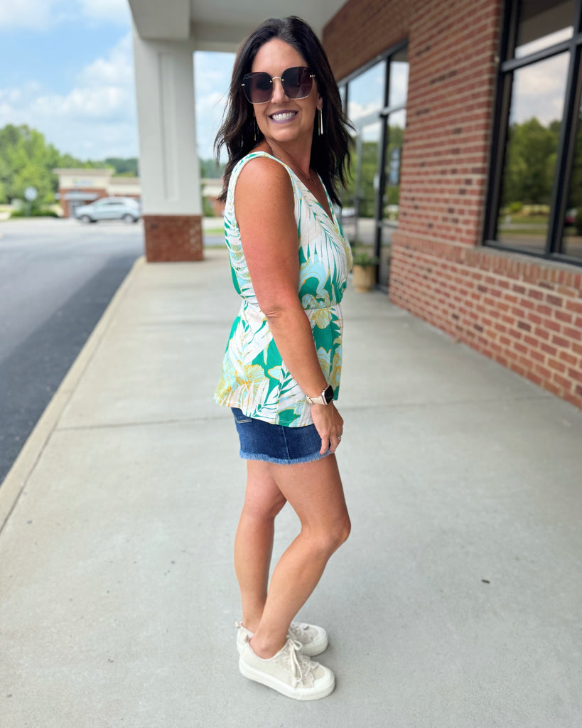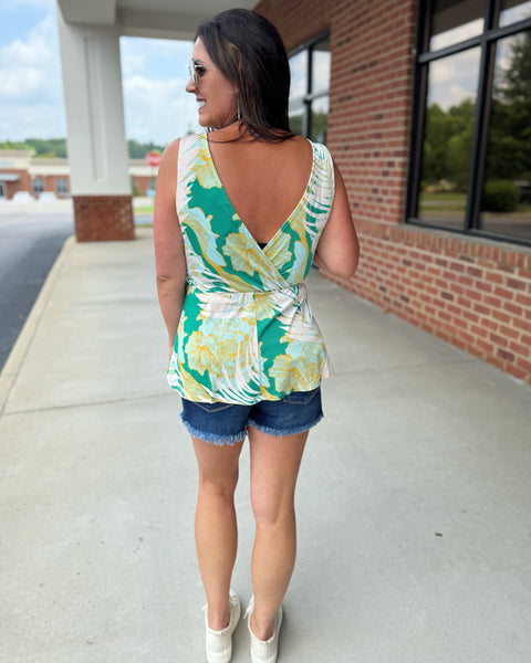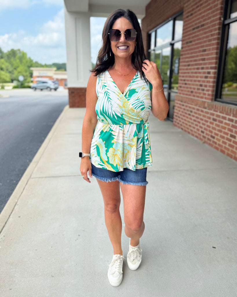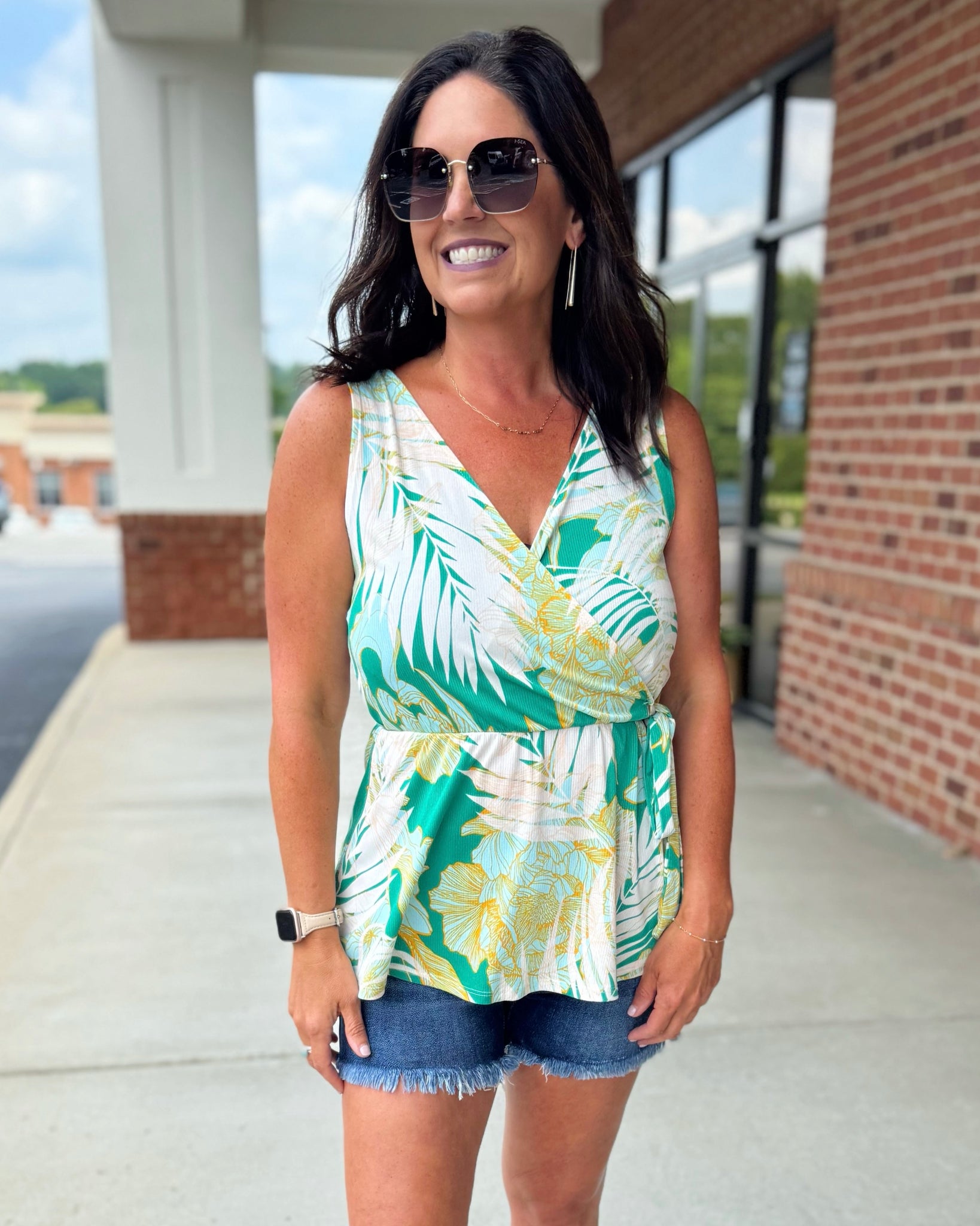 Bring the island vibes wherever you go in our Sally Surplice Sleeveless Tropical Top.