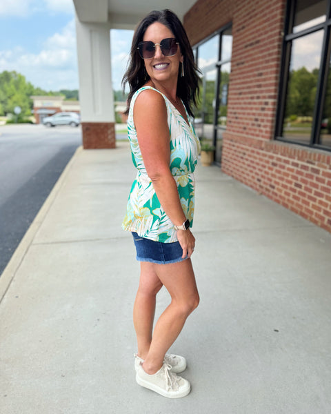 This breezy and bold piece features a flattering surplice neckline that drapes beautifully for a relaxed yet polished silhouette. The vibrant tropical print adds a splash of color and fun, making it the perfect statement top for sunny days. Designed with wide shoulder straps and a lightweight woven fabric, it keeps you cool and comfortable whether you're on vacation or just channeling vacay mode at home. Pairs effortlessly with denim, linen bottoms, or flowy skirts for a fresh, resort-ready look.