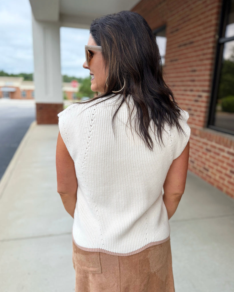 Stacy is 5'4", bust 36C, 5/6 in pants, and a small or medium in most tops depending on fabric and stretch. Stacy is wearing a size small in this sweater.